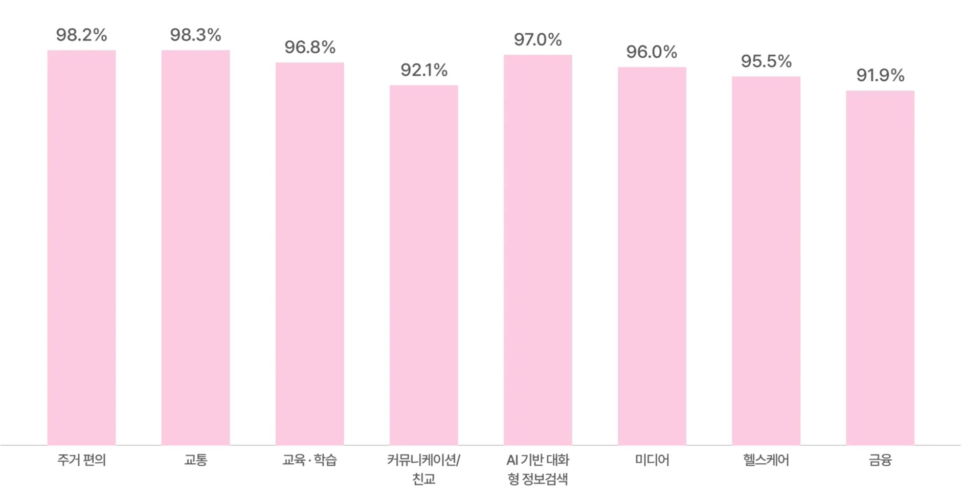 “AI가 도움이 된다”는 응답은 모든 분야에서 90% 이상을 기록했습니다.